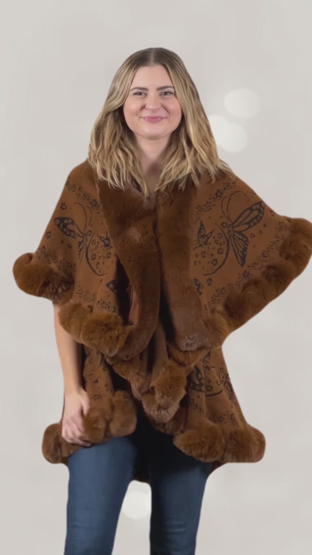 Faux fur kimono Cape with Butterfly jacquard pattern (Caramel)