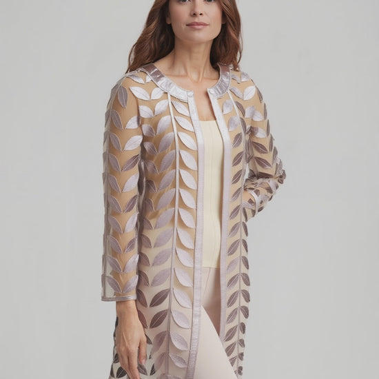 Laser cut Faux Leather leaves on Mesh long Jacket with 3/4 sleeves (Silvergun )