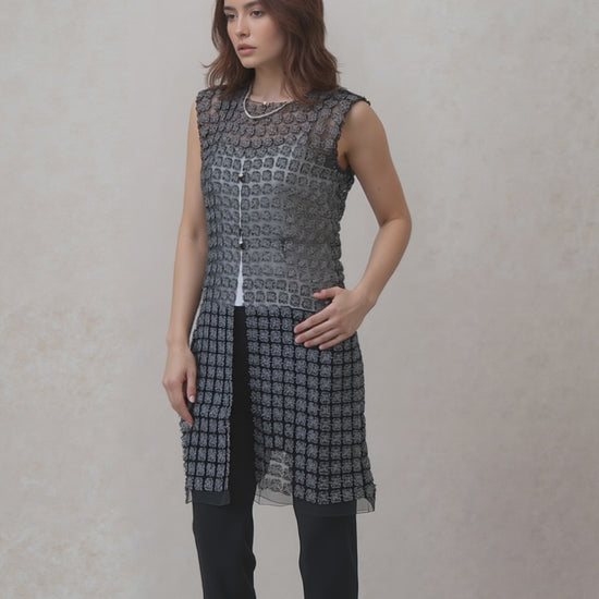 lace Organza Sleeveless long vest with pearl buttons front (Black)