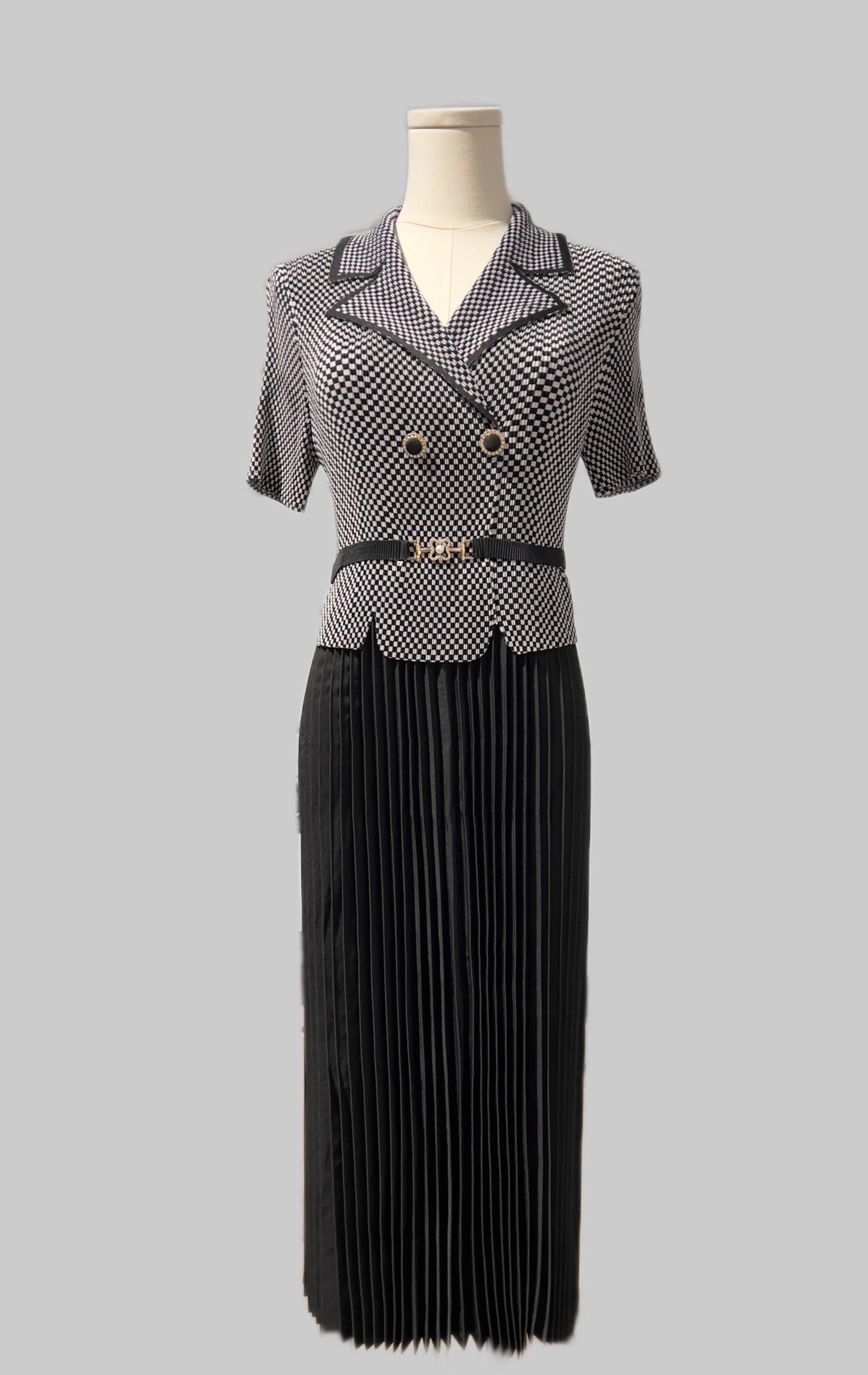 Pleated short sleeve dress with mock suit jacket top buttons and Belt (Black)