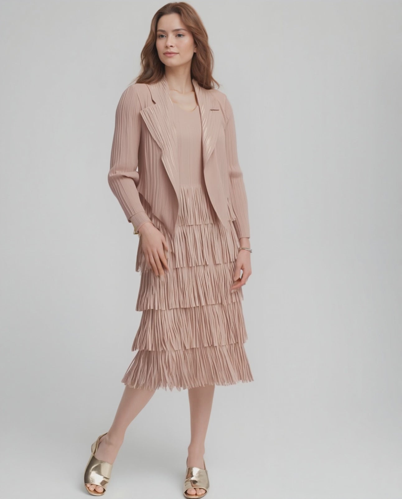 Pleating sleeveless dress & short jacket set with foil print & fringe trim ( Pink)