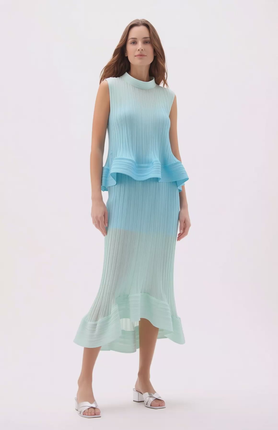 A fresh and feminine two-piece set, this pleated ombre design features Ellyndale’s signature pleating combined with soft gradient color transitions for a light and airy look. The sleeveless peplum top pairs effortlessly with the flowing pleated skirt, creating a coordinated silhouette that is both elegant and refined.