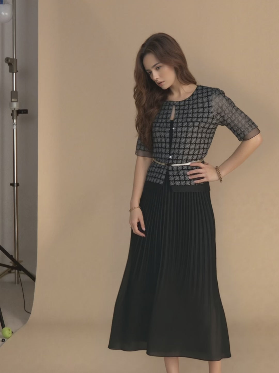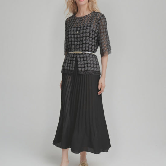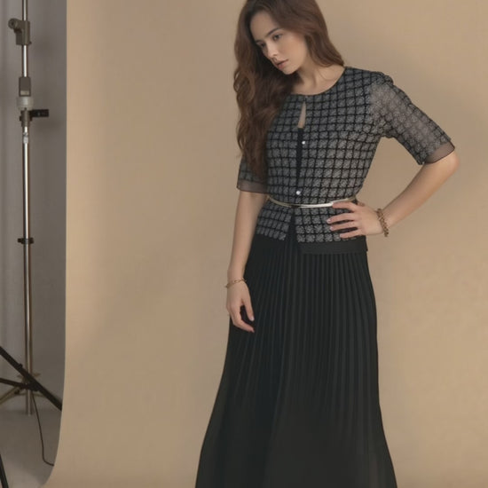 Short Lace Organza shirt with 3/4 sleeves & Pearl buttons front (Black)