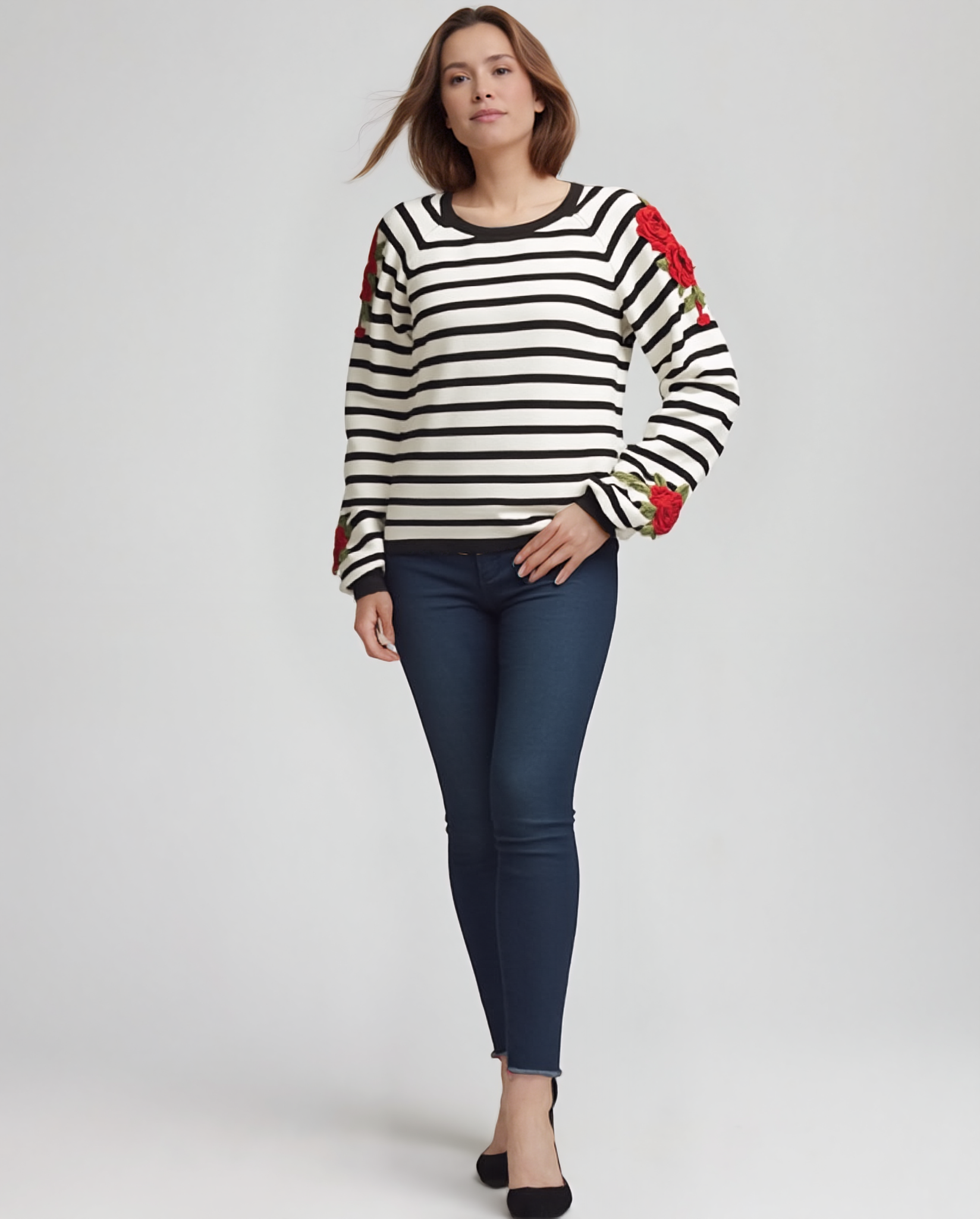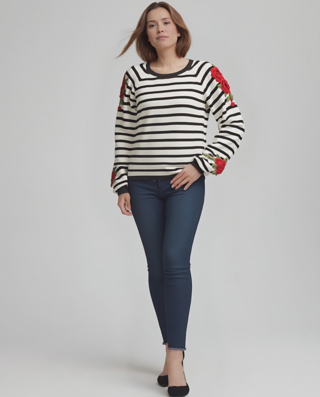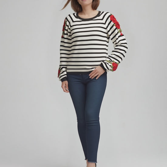 Sweater knit stripe pullover with Rose appliqué on sleeves (Black.white)